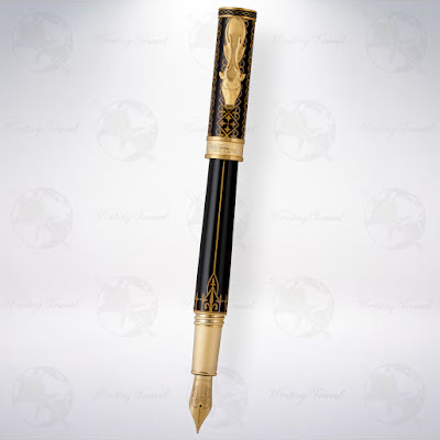 旋蓋打開後,握位和筆尖皆為亮面金黃色,相呼應筆夾和筆環設計,其筆尖上刻有一把劍,左右環繞著多頭龍的設計,相當精緻,圖案底下有Montegrappa標誌和筆尖筆幅。